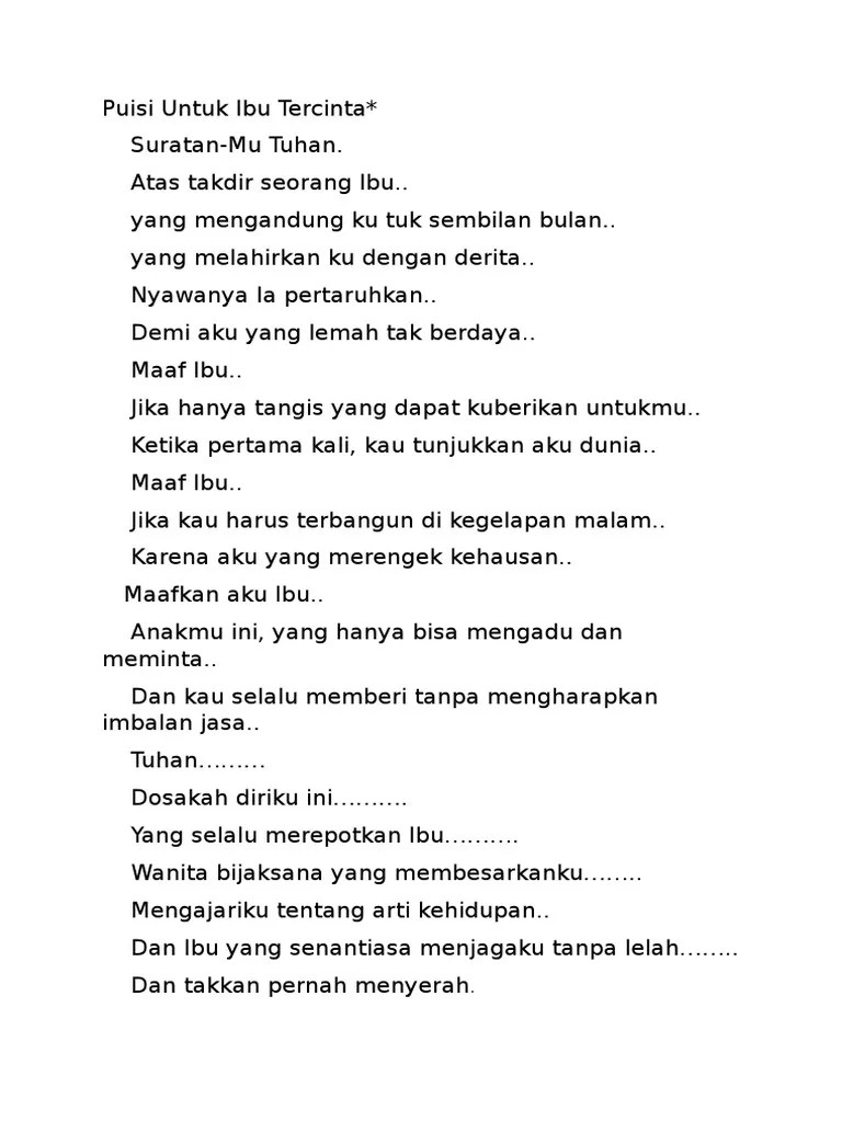 Sampai terbentuk makhluk titipan untukmu. Kumpulan puisi untuk almarhum ibu tercinta, sedih, rindu,. Kumpulan puisi tentang ibu tersayang, sedih. Lengkap ⏩ kumpulan puisi untuk almarhum ibu tercinta paling. Dari anaknya dan puisi dari seorang ibu. Nah, itu dia kumpulan puisi ibu yang cocok untuk kamu bacakan kepada ibu tersayang, toppers! Puisi ibu tersayang yang telah tiada. Artikel ini berisi tentang : Puisi indah dan renungan untuk ayah dan anak. Beberapa kumpulan puisi ibu yang menyentuh hati dengan berbagai tema mulai dari puisi ibu tercinta, tersayang, sedih, ceria, bahasa inggris, dll. Nah bagaimana kata kata ibu dalam bentuk bait bait puisi tentang ibu tersayang, untuk lebih jelasnya puisi untuk ibu, disimak saja dibawah ini puisi ibu . Selain dengan mengucapkannya, rasa kasih sayang . Kumpulan puisi untuk ibu tercinta yang sedih dan menyentuh hati ini bisa kamu jadikan referensi untuk mengungkapkan kepadanya ataupun .